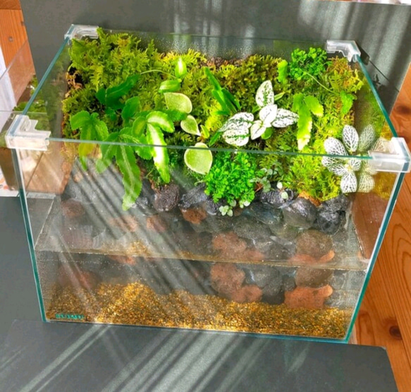 後ろは自然をイメージした苔リウムです。 メダカや、ベタにいかがですか? どちらもエアーポンプなしで飼えます。 受注製作になります。 苔など植物を使用して作られた飼育箱は、見る人に癒しをもたらし、またそれで飼育する生体にはストレスの少ない環境を提供することができます。 家の中にいながら自然を楽しむことができる 苔は、管理しやすいです。 乾いてきたら霧吹きで水をあげてください。 苔のお手入れの仕方が書かれた簡単な説明書をお入れします。 ガラス水槽 横長型(少し台形) 縦14㎝ 横25.7(上側22.3) 高さ20 水槽の在庫は数に限りがあるため購入をお考えの方はお早めにお願いいたします。 砂は生体がまちがって飲み込んでも安心な津軽プレミアムです。 制作は基本、土日祝日はお休みさせていただきます。 ★お客様のご要望におおじて、(+500円〜)手直しやオーダーいたします。 例40センチ水槽で作る・30センチキューブ水槽で作るなど。 ※しっかりと梱包させていただきますが、配送で片寄り、崩れ等が発生する可能性もあります。ご了承の方のみご購入お願いします。 ※水位変更はオーダー価格になります。ご相談ください。 ※予告なしに削除する場合があります。 ※値下げ交渉はできかねます。ご了承願います。 ※レイアウトや苔、材料は写真のような感じにお作りいたしますが、1つ1つハンドメイドのため、同じものはありません、みんな違います。 ※エアーポンプ、フィルターはございません。 #コケリウム #コケテラリウム #植物 #緑 #観葉植物 #アクアリウム #インテリア #癒やし #自然 #魚#ハンドメイド #パルダリウム#ビバリウム #ネダカ#エビ#カエル #グリーン#森林浴#母の日#父の日 |